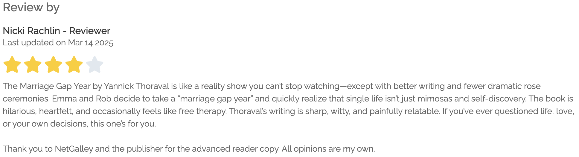 My latest novel, The Marriage Gap Year, is a second-chance romantic dramedy. This book was nominated for the Romance Writers of Australia Ruby Award.